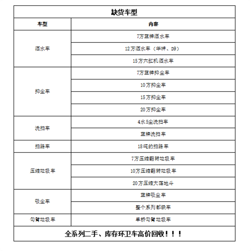 可租赁车型:全新或二手洒水车、洗扫车、清洗吸污车、高压清洗车、吸粪车、扫路车、对接垃圾车、压缩垃圾车、